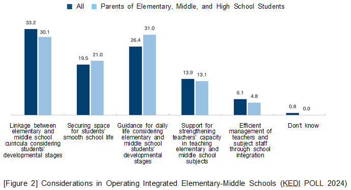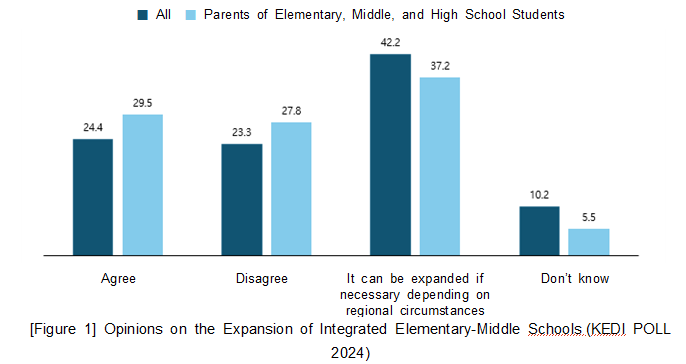 The education opinion survey conducted by the Korean Educational Development Institute (KEDI) is carried out annually with 4,000 adult men and women nationwide aged 19 to under 75 and aims to investigate the public‘s perceptions and attitudes toward education and education policy in Korea, thereby providing reasonable basic data for the establishment, improvement, and implementation of education policy. The 19th KEDI POLL (hereinafter, KEDI POLL 2024) consisted of 9 areas and 49 (+6) questions, and was conducted over about 3 weeks, from August 9 to 29, 2024. This paper reviews the main findings of the newly added survey questions in the 19th poll. □ New Survey Question in Area 2 (School): Integrated Elementary-Middle Schools In the 19th survey, a new item on the expansion of integrated elementary-middle school operation was included. First, among responses from adult men and women nationwide, the order was: “It can be expanded if necessary depending on regional circumstances,” 42.2%; “Agree,” 24.4%; and “Disagree,” 23.3%. Among parents of elementary, middle, and high school students, the responses were: “It can be expanded if necessary depending on regional circumstances,” 37.2%; “Agree,” 29.5%; and “Disagree,” 27.8%. According to the analysis of responses by region, in all regions, the highest response was “It can be expanded if necessary depending on regional circumstances.”