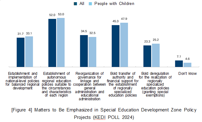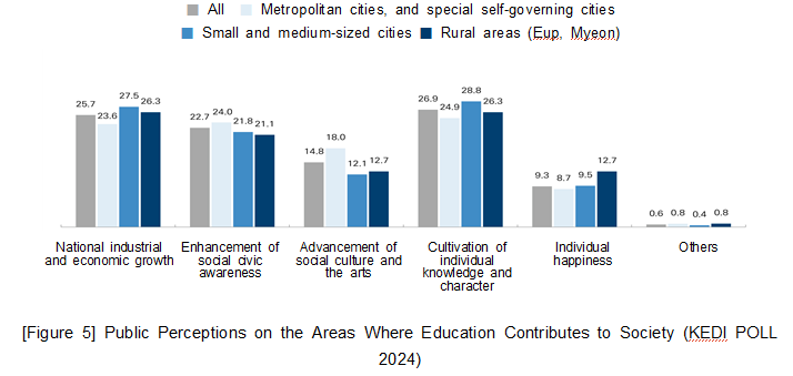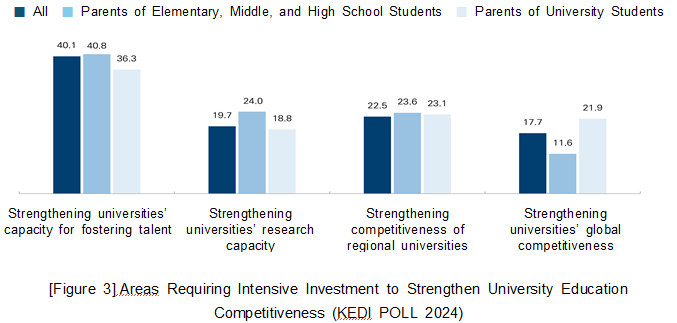□ New Survey Question in Area 6 (Educational Finance): Investment Areas for Enhancing University Competitiveness The year 2024 was the beginning of groundbreaking changes in Korea’s higher education system, such as the Regional Innovation System & Education (RISE) and Glocal Universities. In this context, KEDI POLL 2024 newly surveyed the areas that should be intensively invested in to strengthen the competitiveness of university education. Among adult men and women nationwide, the responses were: “Strengthening universities’ capacity for fostering talent,” 40.1%; “Strengthening competitiveness of regional universities,” 22.5%; and “Strengthening universities’ research capacity,” 19.7%. Among parents of elementary, middle, and high school students, the responses were: “Strengthening universities’ capacity for fostering talent,” 40.8%; “Strengthening universities’ research capacity,” 24.0%; and “Strengthening competitiveness of regional universities,” 23.6%. Among parents of university students, the responses were: “Strengthening universities’ capacity for fostering talents,” 36.3%; “Strengthening competitiveness of regional universities,” 23.1%; and “Strengthening universities’ global competitiveness,” 21.9%.
